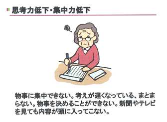 思考力低下・集中力低下は,物事に集中できない,考えがおそくなっている,まとまらない,物事を決めることができない,新聞やテレビを見ても内容が頭に入ってこない,といった症状です.