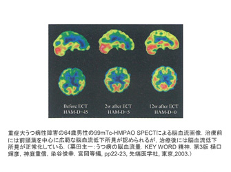 これは64歳の重症の大うつ病の患者さんの頭部MRIとSPECTの写真です.スライドの上の方が前頭葉で下の方が後頭葉です.MRIでは脳血管障害や脳の萎縮などの異常はまったく認められないにも関われず,SPECTでは前頭前野(前頭葉の前の方)に広範な血流低下が認められることがわかります.SPECTで見られる血流低下は代謝低下と相関しており,この所見はうつ病に見られる前頭前野の機能低下を反映するものと考えられます.